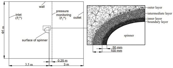 For all the spinner models, the calculation area is a cylindrical area with a length of 6.5 m and a diameter of 5m. According to the distance from the spinner surface, the calculation area is divided into four mesh zones: outer layer zone, intermediate layer zone, inner layer zone, and boundary layer zone. The mesh density increases successively towards the spinner surface, and the computational model is meshed by unstructured grids, as shown in Figure 3. The geometric dimensions and cell numbers of each model are also shown in Table 1.