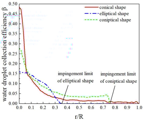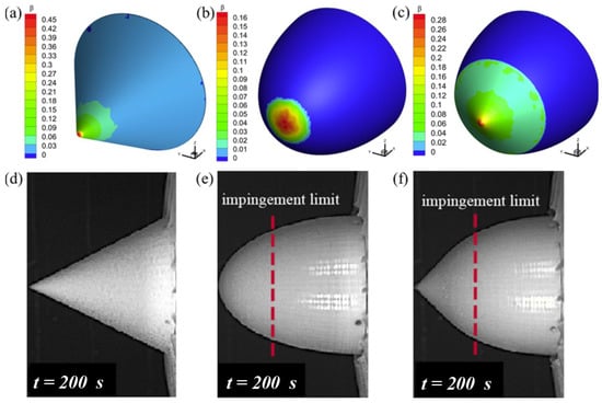 In this section, the effect of spinner shape on droplet impact characteristics is discussed, as well as exploration of the mechanism of the dynamic ice accretion process in the experiments [17] (see Figure 4). Three geometric models were selected with different spinner shapes, and the inflow velocity was maintained at 80 m/s and D/L = 1.2 (1, 5, and 9 in Table 1). The distributions of water droplet collection coefficients β on the three types of spinner surfaces are shown in Figure 4a–c. The results indicate that the impact area covered all the windward surface on the conical-shaped spinner. However, the impact area only covered the front part of the windward surface on the elliptical-shaped spinner and the windward surface of the conical region on the coniptical-shaped spinner.
