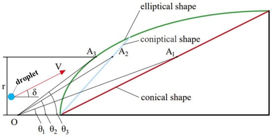 At the front of spinner shape there is a point on the center line of the spinner (see Figure 6), while on the spinner surfaces there is a point () with the distance of to the center line. The origin of the coordinate axis is located at the stationary point of the spinner. The angle is defined as the angle between the center line and the line of . The angle between the motion direction of the water droplet and the axial direction is defined as δ. As shown in Figure 6, the windward area of the three types of spinner shapes has different distributions along the axial position, and the angle increases from the conical shape, to the coniptical shape to elliptical shape. The change of the angle that forms at the front of the spinner shape leads to differences in axial deceleration and radial acceleration regions, and further influences the force of droplets.