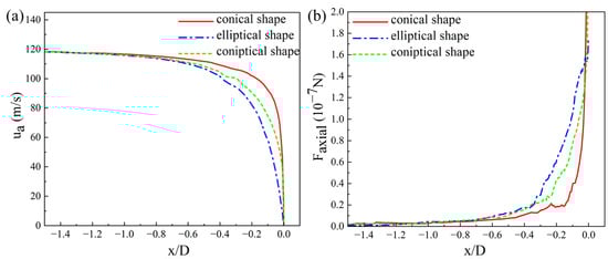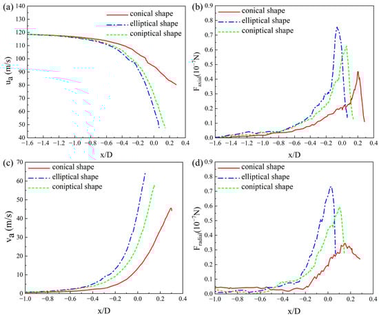 Since the spinner shape is symmetric, the water droplets move along the center line only, with an axial velocity of . Figure 7a shows the axial velocity of air along the center line with . At is not influenced by spinner shape. As the droplet approaches the spinner surface along the center line, first decreases slowly and then decreases quickly to zero for all the spinner shapes. For the conical shape, the rapid decrease of begins at the location of , while for elliptical shape and coniptical shape . Thus, the spinner shape would change the local velocity of air in the front of the spinners. As a result, the axial force acting on the water droplet shows different trend lines for the three spinner shapes (see Figure 7b): of droplets in the elliptical spinner is increases quickly, followed by the coniptical and conical spinners. As the droplet approaches the surface, the change rate of is highest for the conical shape.