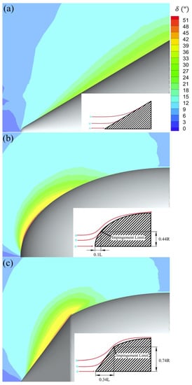 Figure 9 shows the distribution of the angle between the motion direction of the water droplet and the axial direction. Along the conical spinner surface, continuously increases, but is always smaller than the half angle of the cone (~31 °), so droplets impact on the whole spinner surface, even in the rear of the spinner (see Figure 10a). Similar phenomena occur on the conical segment of the coniptical spinner. Initially, the impingement limit, , along elliptical spinner surface is smaller than the angle between the local tangent line and axial direction. In contrast, after passing through the impingement limit (see elliptical spinner and the elliptical segment of the coniptical spinner in Figure 9b,c), of the local droplet velocity is larger than the angle between the local tangent line and axial direction, so no droplets land on the surface (see Figure 10b,c). The conical segment guides water droplets to move parallel to the surface, while the elliptical segment causes water droplets to move away from the wall.