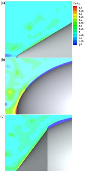 Distribution of the ratio of the local water volume fraction () to the water volume fraction at the inlet (): (a) conical spinner; (b) elliptical spinner; (c) coniptical spinner.