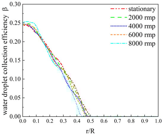 In the range of the rotational speed of the spinner from 0 to 8000 rpm, the effect of rotational speed on droplet impact characteristics was analyzed on the elliptical spinner. The inflow velocity was maintained at 120 m/s and D/L = 1.2 (see No. 6 in Table 1). Figure 11 shows the influence of rotational speed on water droplet collection efficiency β. The trend lines of β are similar at different rotational speeds. However, the high rotational speed slightly shortens the distance from the stagnation point to the impingement limit. The position of the impingement limit r⁄R was 0.5 on the stationary surface, while r⁄R was 0.44 at the rotational speed of 8000 rpm. Similar phenomena are described in the literature [15,16].