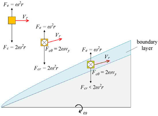 The influence of rotational speed on the spinner was further analyzed from the aspect of forces acting on the droplets. In a rotating coordinate system, the governing equation of elemental volume is expressed by Equation (2), and the influence of centrifugal force and Coriolis force on the motion of droplets is shown in Figure 12. The axial velocity independent of the Coriolis and centrifugal forces is ignored in the discussion.