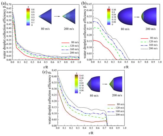 In the range of inflow velocities from 80 m/s to 200 m/s, the effect of inflow velocity on droplet impact characteristics on the three spinner shapes was investigated (1–12 in Table 1), as shown in Figure 13. Figure 13a shows variations of the water droplet collection coefficient at different inflow velocities on the conical spinner. As the inflow velocity increases, the water droplet collection coefficients on the whole windward surface increase correspondingly.