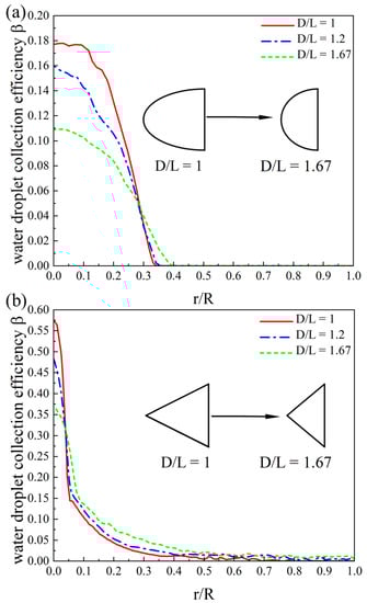 Influence of D/L on water droplet collection efficiency: (a) elliptical spinner; (b) conical spinner.