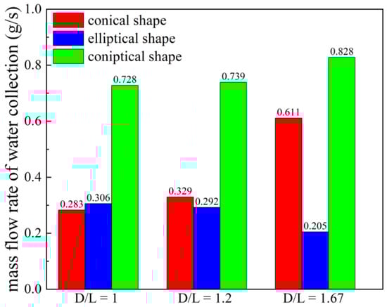 The results show that on the droplet-covered surface, the elliptical shape had the smallest mass flow rate of water collection at 0.292 g/s. Mass flow rates of water collection were 0.329 g/s and 0.739 g/s on the conical-shaped spinner and the coniptical-shaped spinner, respectively. Thus, water droplet collection was considerably different on the three spinner shapes, which is further analyzed in the following section.