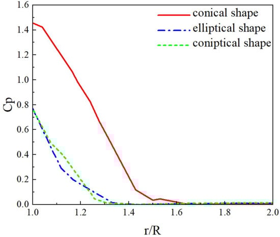 Figure 17 shows the profile of the total pressure loss coefficient along the radial axis for the three spinner shapes (). The inflow velocity was maintained at 80 m/s and D/L=1.2 (No. 1, 5, 9 in Table 1). The trend lines of through the elliptical spinner and the coniptical spinner were similar: the maximum was ~0.8 and the area of pressure loss was within . The trend line of through the conical spinner was above the lines of the other two types of spinners. The maximum value of was 1.45 and the area of pressure loss was within .