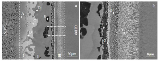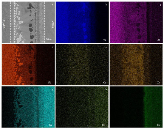 The Ti2AlNb alloy and GH99 superalloy were successfully brazed using amorphous TiZrCuNi as the filler alloy, as illustrated in Figure 3a. The brazing seam could distinguish three zones in brazed joints according to the contrast of interfacial microstructure, which were named zone I (diffusion zone at Ti2AlNb alloy side), zone II (reaction zone), and zone III (diffusion zone at GH99 side). From Figure 3b,d, it can be seen that Ti and Nb elements were mainly distributed in zone I, and their content gradually decreased in zone II and zone III. The Ti, Zr, Ni, Cu, Nb, and Al elements were mainly centered in the brazing seam. The distributions of the elements in the brazed joint indicated sufficient diffusion between the parent metal and the filler alloy. Combining Figure 3a,b,g, it was apparent that the black phase in zone II mostly contained Ti, Ni, and less Al, Nb. Despite the low levels of Cr and Co in the braze seam (zone II), the fact that Co was present in higher concentrations than Cr suggested that Co was more likely to diffuse into the braze seam. Because Cu and Zr were components of the brazing alloy, it was possible to see that they were distributed evenly throughout the brazing seam in Figure 3e,f. Zone III was primarily concentrated with Ni, Cr, and Co, as seen in Figure 3g,h,i.