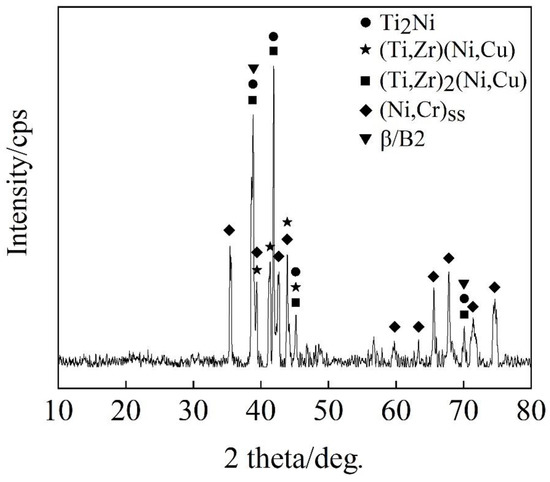 The typical interfacial microstructure of the brazed joint is illustrated in Figure 4. Table 2 displays the findings of the EDS analysis for each phase. The phases marked as A and C had similar atomic percentages. Phase A had more Al elements and fewer Nb elements than the C phase. The phases A and C contained mainly Ti, Al, and Nb elements and the atomic percentages were similar to the B2 phase of the Ti2AlNb parent metal. Owing to the high relative content of Nb (β phase stabilizer of titanium alloy), phases A and C could be inferred as β/B2 phases, as demonstrated in Ref. [8]. The phases marked as B and D had similar contents consisting mainly of the elements Al, Nb, Ti, and Ni. It can be seen from Table 2 that the atomic percentages of Ti and Ni are close to 2:1. Compared to the Ti2Ni phase, the B and D phases had a higher concentration of Al, Nb. Ren et al. also found that the Ti2Ni phase contains higher Al and Nb elements, and the research suggested that it was the dissolution of these elements in the brazing seam into the Ti2Ni phase. Therefore, phases B and D were suggested to be Ti2Ni (Al, Nb) phases, as demonstrated in Refs. [18,19]. In addition, as observed in Figure 5, diffraction peaks of Ti2Ni were detected on the fracture surface of the Ti2AlNb side, further proving the formation of Ti2Ni (Al, Nb) phases in the joint. It could be seen from the ternary phase diagrams [20,21] of Ti-Zr-Cu and Ti-Zr-Ni that Ti was miscible with Zr and Cu was miscible with Ni. In phase E, the atomic percentages of Ti and Zr elements were 64.77%, while Ni and Cu elements were 30.97%. The atomic percentage was close to 2:1, and phase E was identified as the (Ti, Zr)2(Ni, Cu) phase [13]. Similarly, phase F could be considered the (Ti, Zr)(Ni, Cu) phase [17]. In zone III, the phases G, H, and I mainly contained Ni, Cr and Ti elements. With approaching the GH99 side, the content of the Ti element gradually decreased. This indicated the diffusion of elements from the brazing seam into the GH99 alloy. Simultaneously, the elements in GH99 alloy diffused into the brazing seam and eventually converged in the diffusion zone (zone III). According to the Ni-Cr-Ti phase diagram [22], it could be determined that the phases G, H, and I were (Cr, Ni, Ti) ss. Phase J mainly contained Ni and Cr elements. Based on the Ni-Cr binary phase diagram [23], phase J could be determined as (Ni, Cr) solid solution [24]. The XRD analysis identified five phases, which were in agreement with the findings of the EDS analysis, as illustrated in Figure 5: B2/β, (Ti, Zr)(Ni, Cu), (Ti, Zr)2(Ni, Cu), (Ni, Cr) ss, and Ti2Ni. In conclusion, the microstructure of the interface of the Ti2AlNb/GH99 joint was Ti2AlNb alloy/B2/β/Ti2Ni (Al, Nb) + B2/β + (Ti, Zr)2(Ni, Cu) + (Ti, Zr)(Ni, Cu)/(Cr, Ni, Ti) ss + (Ni, Cr) ss/GH99 superalloy.