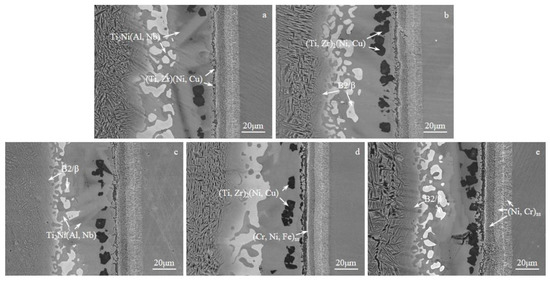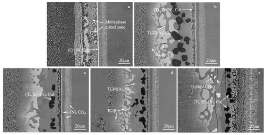 The BSE diagram of the joint for different holding times is illustrated in Figure 7. There was no significant change in interfacial microstructure with increased holding time. The short holding time did not allow the elements in the filler alloy to diffuse sufficiently with the parent metal, and the brazing seam was dominated by the Ti2Ni (Al, Nb) phase, with less β/B2 phase. With the extension of holding time, the (Ti, Zr)2(Ni, Cu) phase and (Ti, Zr)(Ni, Cu) phase in the brazing seam increased. With extended holding time further, continuous brittle intermetallic compounds were formed in the brazing seam. During the following cooling stage, cracks were generated and propagated along the brittle phase, reducing the strength of brazed joints.