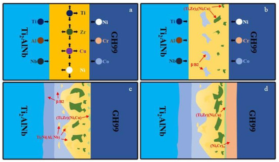 Based on the above discussion, the interfacial microstructure evolution during the brazing process is suggested in Figure 8. As the temperature increased to the filler alloy’s melting point (853 °C) during the early stages of brazing (as illustrated in Figure 8a), the brazing filler began to melt. The brazing seam had higher concentrations of the elements Ti, Zr, Ni, and Cu. Due to the concentration gradient, Zr and Cu elements diffused to the parent metal on both sides, and Al, Nb, Cr, and Co elements in the parent metals also diffused into the brazing seam. In comparison to elements Cr and Co, the Ni in GH99 superalloy diffused more readily into zone II [22]. The strong affinity for Ni allowed the Ti and Ni in the filler alloy to diffuse to the GH99 and Ti2AlNb, respectively. With the increase of Ti and Ni concentrations, β-Ti and (Ti, Zr)2(Ni, Cu) were formed during the cooling process, as shown in Figure 8b. Extending the holding time, the element diffused between the parent metal and filler alloy was more adequate. The elements Nb, Ni, and Cu were clustered on the Ti2AlNb side of the alloy. The maximum solubility of Cu and Ni in β-Ti (13.5 at. % and 10 at. %) was much higher than that of α-Ti, and Nb was a stable element in β phase. The Ti, Nb, and Cu content at higher brazing temperatures was beneficial to the nucleation and growth of β-Ti. Therefore, a diffusion zone (zone I) dominated by the β/B2 phase was formed on the Ti2AlNb side. In addition, many elements such as Ti, Ni, Nb, and Al were gathered in the brazing seam. According to the existing research, Ni and Ti elements had good affinities, and the Gibbs free energy of 2Ti + Ni = Ti2Ni was −78.03 KJ/mol [26], so the continuous Ti2Ni (Al, Nb) phase was formed in the brazing seam. Due to the long-distance diffusion of elements, many Ti, Ni, Zr, and Cu elements were accumulated on the GH99 alloy side, as shown in Figure 3. Finally, a continuous (Ti, Zr) (Ni, Cu) phase was formed on the GH99 side, which hindered the diffusion of Cr and Co into the brazing seam. Eventually, these elements aggregated on the GH99 side (zone III) to form a Ni-Cr-based solid solution, as shown in Figure 8d.