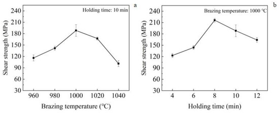 Shear strength of Ti2AlNb/GH99 joints at various parameters. (a) Brazing temperature and (b) holding time.