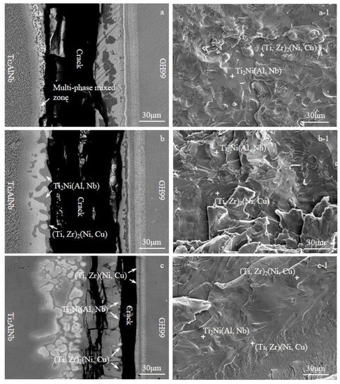 The fracture path of the bonded joint was analyzed by SEM. The fracture paths of the Ti2AlNb/GH99 brazed joints at various temperatures are shown in Figure 10a–c, and the corresponding fracture surface is shown in Figure 10(a-1–c-1). At different temperatures, the fracture surfaces of the Ti2AlNb/GH99 joints showed smooth and flat, indicating that the joints were brittle fracture, as shown in Figure 10(a-1–c-1). EDS analysis of the fracture showed that the fracture surface was mainly Ti2Ni (Al, Nb) phase and (Ti, Zr)2(Ni, Cu) phase when the brazing temperature was below 1000 °C. When the temperature was 1040 °C, the fracture surfaces were Ti2Ni (Al, Nb), (Ti, Zr)2(Ni, Cu), and (Ti, Zr)(Ni, Cu) phases. Combining Figure 10a–c, it was evident that as the temperature rose, the joint fracture path shifted in favor of the GH99 side. A continuous lamellar organization formed on the Ti2AlNb side at 960 °C because the reaction between the parent metal and the filler alloy was insufficient at that temperature. These mixed phases became the weak spots in the joint, where most of the fractures occurred. Combined with Figure 9a, it could be seen that the average shear strength of the joint at this temperature was lower at 116.0 MPa. With the increased brazing temperature, the B2/β phase was formed on the Ti2AlNb side, and the fracture path moved to the brazing seam. Consequently, there was also an increase in joint strength. When the brazing temperature reached 1040 °C, the coarse Ti2Ni (Al, Nb) and (Ti, Zr)2(Ni, Cu) phases in the brazing seam were also harmful to the joints’ properties and caused some microcracks, as illustrated in Figure 10c. It was well known that a continuous metal interlayer was detrimental to the properties of the joint. As a result, the presence of a large number of Ti2Ni (Al, Nb) layers or continuous (Ti, Zr)2(Ni, Cu) layers of intermetallic compounds in the Ti2AlNb/GH99 joints obtained at low brazing temperatures (960 °C) or high temperatures (1040 °C) made the brazed joints lower in strength.