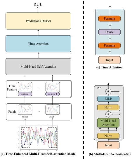A joint deep learning model combined with a multi-head self-attention (Transformer encoder) model and time-attention model was constructed to predict the RUL. Figure 1 illustrates the architectural design of the model. It is composed of five layers: the data time-division module, the time feature enhancement module, the multi-head self-attention module, the time-attention module, and the prediction module. This chapter introduces the modules involved in detail.