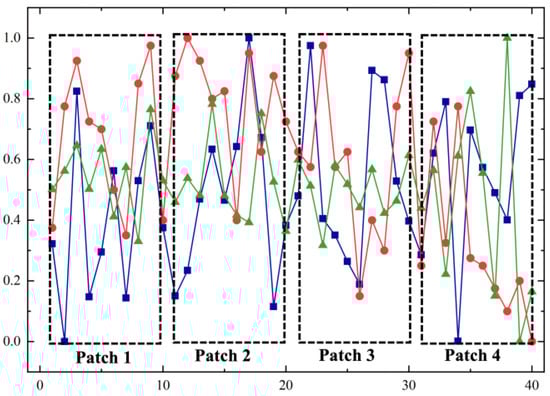 The standard Transformer encoder network’s input data are a group of text sequences. The prediction task presented in this paper was already a complete two-dimensional matrix with a time-series relationship. At the same time, to strengthen the continuous time-series relationship, we divided the input data with a time length of 40 into four patches with a time length of 10. This means that we treat each patch as a minimum unit, simply reshaping each patch into a one-dimensional vector to replace each word in natural language processing tasks. This can significantly lower the overall network’s computational complexity and better reflect key feature information. Additionally, it can reflect the time relationship within the patch. Figure 2 illustrates the division method.