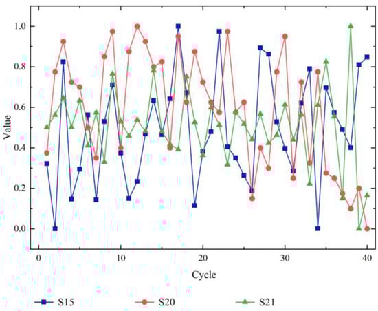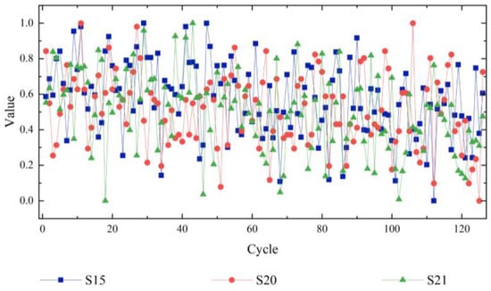 The dataset utilised in this study was NASA’s C-MAPSS engine degradation simulation dataset []. Each engine in this dataset contains data obtained from 21 sensors and three operational setup settings. This dataset classifies the entire dataset into four categories based on operational conditions and failure modes: FD001, FD002, FD003, and FD004. Figure 3 shows an example of three parameters of an engine (normalised data).