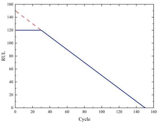 In reality, predicting the RUL of an aircraft engine based on its current operating parameters is difficult. Given that the data created by the long-term operation of the aero-engine are a long-time sequence and the engine’s performance is stable in the early phase of operation, the performance degradation is not evident. Due to a variety of factors, such as hardware wear and ageing during operation, the engine’s RUL reduces as the operation time grows. As illustrated in Figure 4, the piecewise linear degradation approach was employed to fit the connection between service time and remaining engine life. We obtained the number of cycles the engine continues to operate as the RUL and set a predetermined maximum RUL during the initial stages of engine operation.