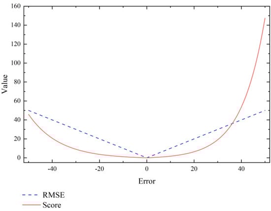 - When predicting the RUL of an aero-engine, there are two possible outcomes: the predicted RUL is less than the actual RUL, or the predicted RUL is greater than the actual RUL. In both circumstances, the approach used by RMSE bears the same penalty. In practice, however, the underestimated RUL prediction benefits from having an early warning signal, hence decreasing the probability of fatalities caused due to engine damage. As a result, the scoring index score is proposed in Equation (8). The cost of an overestimated RUL prediction, on the other hand, is significantly higher than the cost of an underestimated one. This method is more practical and enables a more accurate evaluation of the model prediction effect.
