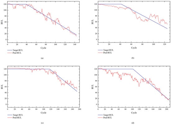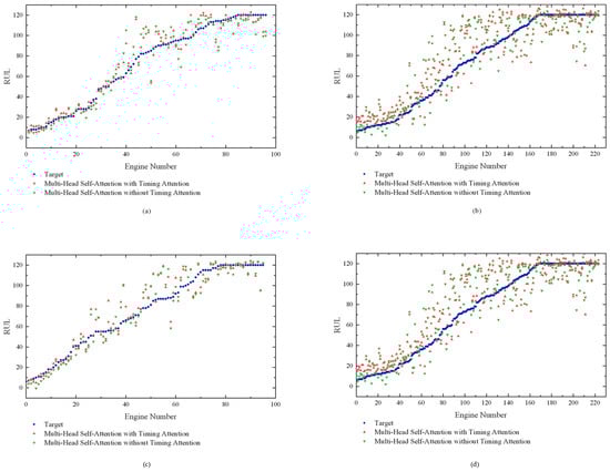 Figure 7 depicts the experimental results of the proposed model on the CMAPSS dataset. Figure 7 illustrates the prediction outcomes of sub-datasets under diverse operation settings (for the convenience of observation, we sorted the remaining lifetimes observed from high to low). As indicated in Figure 7, the remaining service life prediction results for a single engine are not desirable. This may be because, although the dataset offers a high number of parameters, the relationship between the parameters and the degradation characteristics is unclear or the overall parameter values are very little. It is evident that the algorithm model provided in this study is vastly superior when the remaining service life of the engine is short. This could be because the engine’s parameters did not considerably alter throughout the early degradation period. Hence, this demonstrates that the model proposed in this study has the potential to effectively perform preventive tasks. In other words, the model can effectively provide pertinent recommendations when engine failure is imminent.