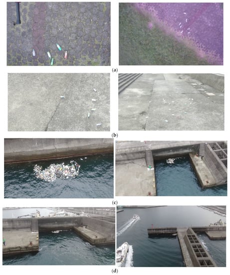 In the HAIDA trash dataset, the images of trash in Taiwan were collected by UAVs. The bottle is the first class of the HAIDA dataset. In Figure 2a, such bottles were captured by a UAV from heights of 3 and 10 m on the campus of the National Taiwan Ocean University (NTOU). Garbage is the second class in the HAIDA trash dataset. We consider this garbage as plastic trash with no clear shape definition (unlike bottles). In Figure 2b, the bottles were captured by a UAV from heights of 3 and 5 m on the coastline of the NTOU. In Figure 2c–h, the garbage and the bottles were captured at 3 to 30 m heights in the Badouzi fishing port. In Figure 2i, the garbage and the bottles were captured by a UAV at 6 and 15 m heights along the Gongliao beach coastline. Figure 3 shows the negative samples in the HAIDA trash dataset.
