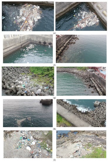 Garbage and bottles in the HAIDA trash dataset. (a) Bottles on the campus of the NTOU at heights of 3 and 10 m. (b) Bottles on the coastline of the NTOU at heights of 3 and 5 m. (c) Garbage and bottles in the Badouzi fishing port at heights of 4 and 10 m. (d) Garbage and bottles in the Badouzi fishing port at heights of 20 and 30 m. (e) Garbage in the Badouzi fishing port at heights of 3 and 7 m. (f) Garbage in the Badouzi fishing port at heights of 3 and 12 m. (g) Garbage and bottles in the Badouzi fishing port at heights of 7 and 15 m. (h) Garbage and bottles in the Badouzi fishing port at heights of 10 and 30 m. (i) Garbage in the Gongliao beach at heights of 6 and 15 m.