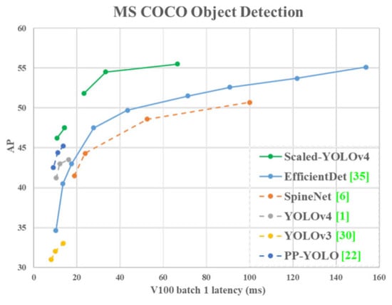 Scaled-YOLOv4 is currently the state-of-the-art object detector based on CSPNet and YOLOv4. A comparison of average precision (AP) and latency for the state-of-the-art object detectors is shown in Figure 4.