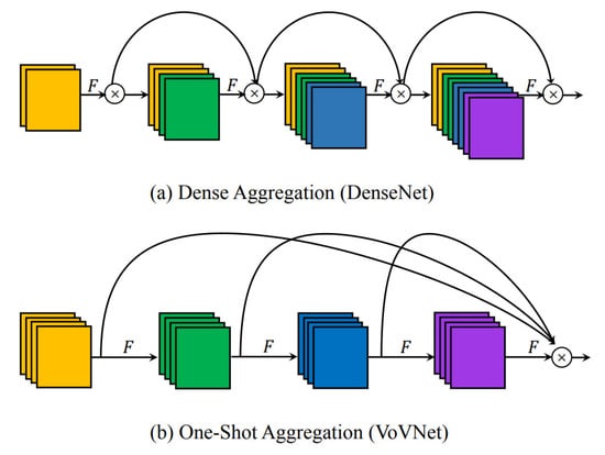 The backbone of YOLOv4-Tiny is CSPOSANet, which is inspired by CSPNet and VoVNet []. In VoVNet, the authors proposed a one-shot aggregation (OSA) module that concatenated all features only once in the last feature map to resolve the heavy memory cost (MAC) and the inefficiency of the computation of DenseNet [], as shown in Figure 5.