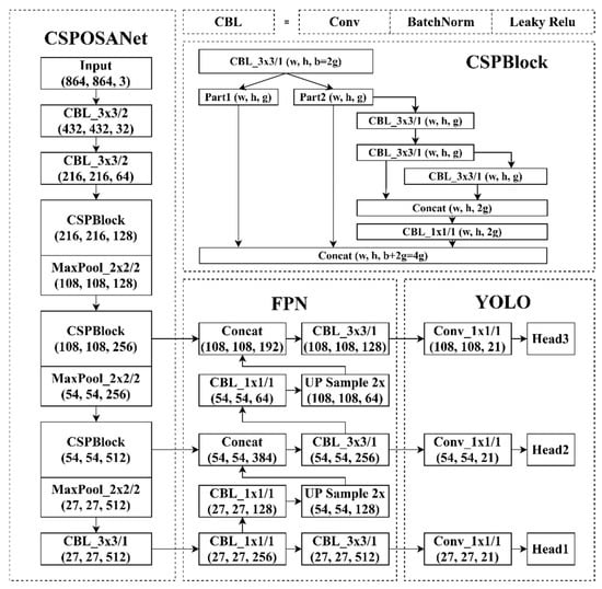 There are three CSP blocks followed by max pool layers in CSPOSANet, as shown in Figure 6. The FPN structure is used in YOLOv4-Tiny-3l to integrate the feature maps and obtain more semantic information like with YOLOv3. YOLOv4-Tiny-3l uses three YOLO heads to predict objects across scales like YOLOv4 but does not use multiple anchors to predict per object; YOLOv4-Tiny-3l uses one anchor to fit one object. YOLOv4-Tiny [] achieves the best performance in SOTA tiny models, as shown in Table 1.