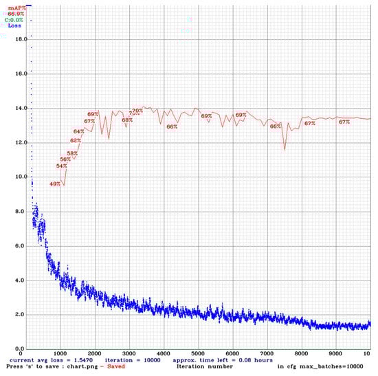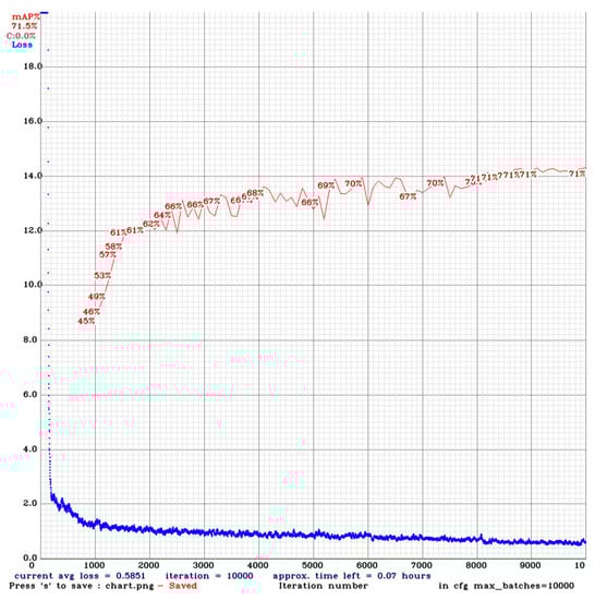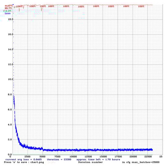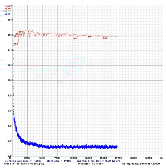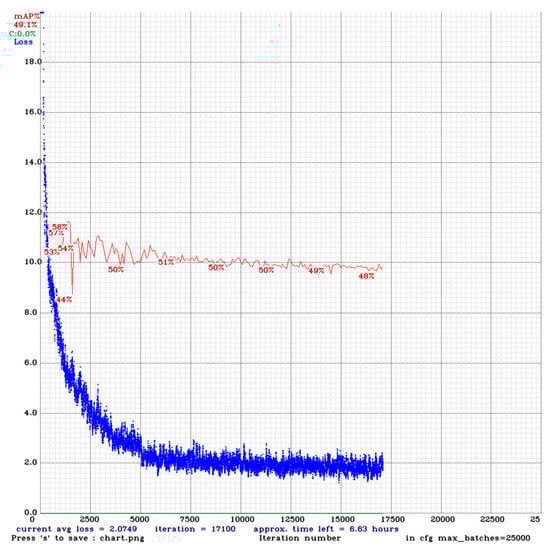 The performance of the model is dependent on the data. We had a TACO trash dataset, which was collected by anonymous providers from different places. We also downloaded some trash data from the internet (crawler trash dataset). Further, we collected some aerial images from our UAV (simple aerial trash dataset). Due to the disorganized data content of beach trash, human error was highly probable in trash labeling. This led us to explore the impact of the dataset on the target detection task from the initial aerial shot dataset. For data mining, we used the holdout method to divide the dataset into a training set and a validation set (70% and 30%, respectively). YOLOv4 was trained for data mining and tested with the HAIDA trash dataset. After training, YOLOv4 obtained 99% mean average precision (mAP) on the simple aerial trash validation set, as shown in Figure 15. We used the TACO dataset (for segmentation) and relabeled it for object detection. After training, YOLOv4 obtained 83% mAP on the TACO validation, set as shown in Figure 16. We also used the dataset from the internet (crawler trash dataset) and labeled it for object detection. After training, YOLOv4 obtained 58% mAP on the crawler trash validation, set as shown in Figure 17.