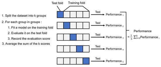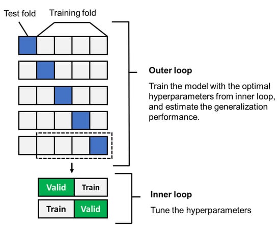 Nested cross-validation includes the outer and inner loop; the outer loop and inner loop are divided into k1 and k2 folds like the k-fold cross-validation. First, the inner loop is used to tune the hyperparameters, and the best one is chosen. Subsequently, these hyperparameters are applied to the outer loop for the model evaluation. This is repeated k1 times, and the errors are averaged, as shown in Figure 11 (k1 = 5 and k2 = 2).