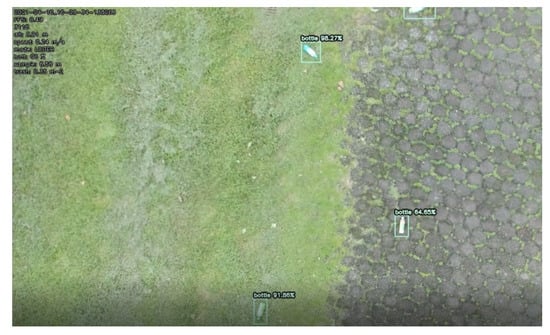 We needed the model to predict the diverse trash types in multiple scales with good precision. The TACO and crawler datasets were not suitable for our UAV trash detector. We added some new aerial trash images collected by the UAV to the HAIDA dataset. We called it the HAIDA-2 trash dataset. There were 1880 aerial images with two classes (6179 garbage objects and 2563 bottle objects) and 556 negative samples. Figure 18 shows the HAIDA-2 trash dataset that was detected by YOLOv4-Tiny-3l (864).