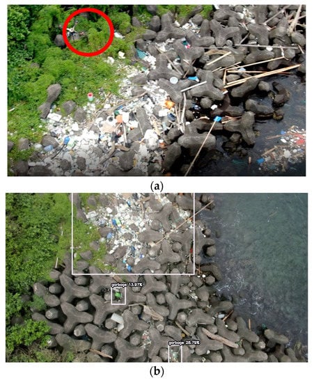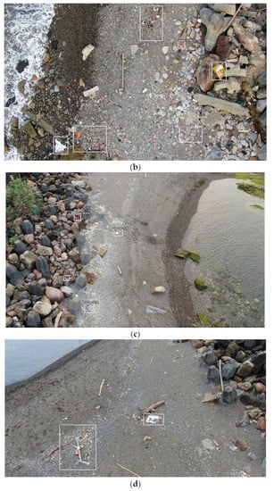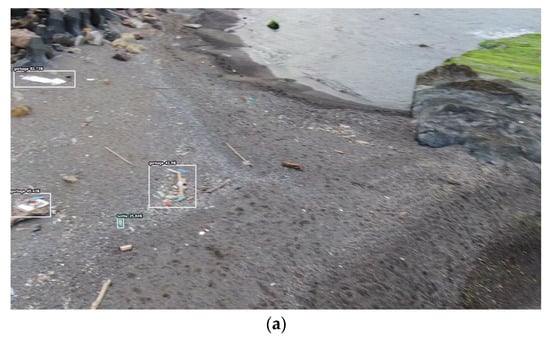 There was more plastic debris on the Wanghai Xiang beach, which easily confused both human detection and the trash detector to result in false-positive (FP) detection, as shown in Figure 14. The YOLOv4-Tiny-3l model was trained from the HAIDA dataset, and the UAV flew at a height of 5 m.