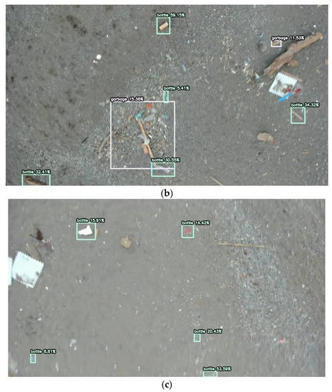 Trash detection at Wanghai Xiang beach. (a) The detection result of the trash detector at location 1. (b) The detection result of the trash detector at location 2. (c) The detection result of the trash detector at location 3.