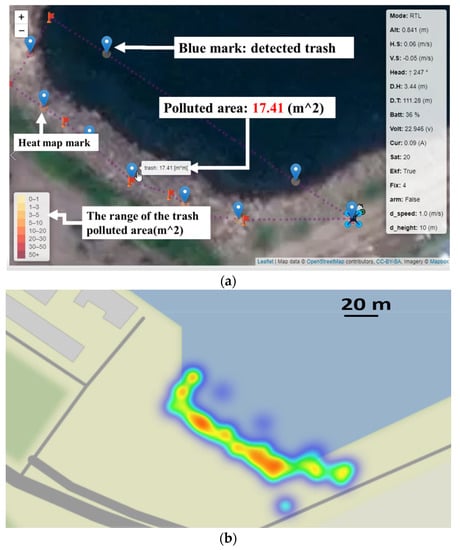 The real-time trash detection results were sent to the ground monitoring station, as shown in Figure 19a. The red flags are the target waypoints in the UAV monitoring mission. For the trash information, the blue markers indicate where the trash is detected, and the circle area presents the severity (color based on the trash polluted area table, as shown on the bottom left of Figure 19a) of the trash pollution area. The purple circles are the flight trajectory of the UAV, and the UAV status dashboard is shown on the right-hand side of Figure 19a. The trash information is saved in the database to query the data for the heatmap analysis for potential use by an environmental protection agency, as shown in Figure 19b. The heatmap also points out the severity of the trash pollution in the Badouzi fishing port. In the future, the overall heatmap analysis can potentially cover all coastal areas of Taiwan.