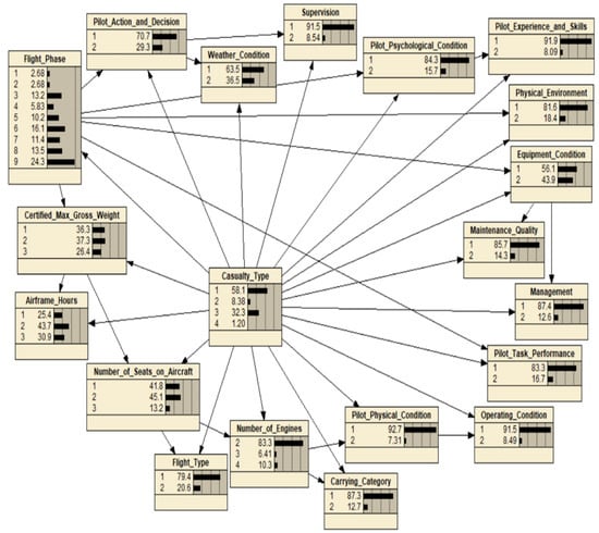 Table 3 gives the MI between “casualty type” and RIFs, which can be used to determine the degree of influence of individual RIFs. When “casualty type” is the parent node, “weather condition” has the largest effect on the casualty type with the corresponding MI value of 0.3434, while “flight type” has the smallest effect with the corresponding MI value of 0.0032. Moreover, it can be seen that many MI values are less than 0.05, thus, 0.05 is selected in this study as the threshold for selecting the factors for further discussion []. As a result, five RIFs are considered, namely, “weather condition”, “flight phase”, “equipment condition”, “pilot action and decision”, and “maintenance quality”. However, it does not rule out the possibility of using a smaller value to consider more factors in the discussion when and where appropriate.