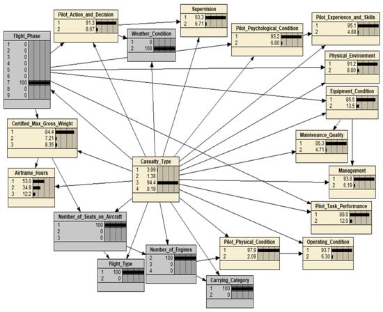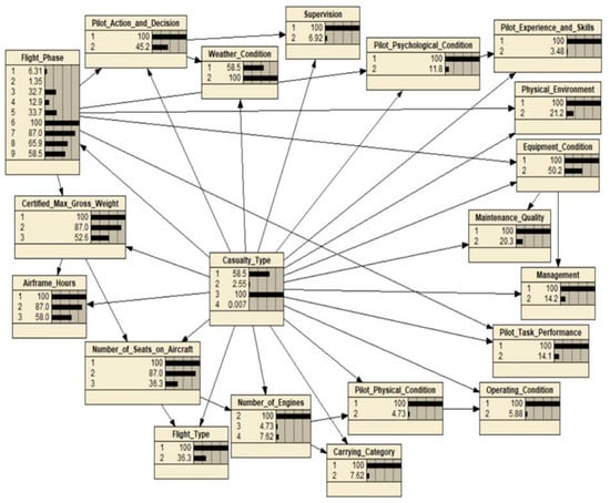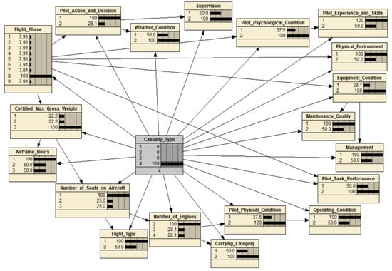 After training of the TAN-BN model with 163 individual pilot-related accidents under Part 121 in the NTSB aviation accident database from 2008 to 2020, it was found that most of the civil aviation accidents resulted in no injury, supporting the argument by Waycaster et al. that civil aviation is the safest way to travel []. On the other hand, if there are casualties in an accident, the most probable casualty type is serious injury, the second is minor injury, and the least is fatal injury.