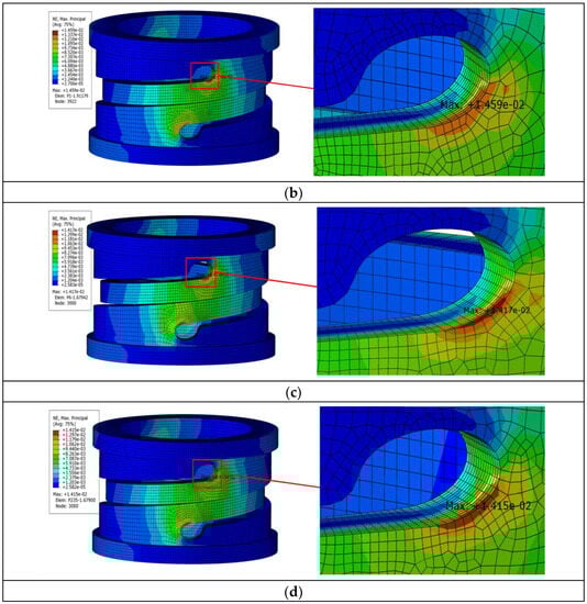 Simulation results (strain contour plot) of the spring with optimized elliptical relief groove: (a) With MOPS—Kriging; (b) With MIGA—Kriging; (c) With MOPS—RBF; (d) With MIGA—RBF, MIGA—response surface and MOPS—response surface.