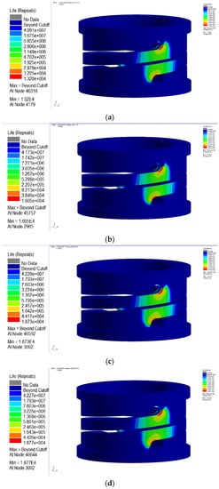 Fatigue life analysis results of the spring with optimized elliptical relief groove: (a) With MOPS—Kriging; (b) With MIGA—Kriging; (c) With MOPS—RBF; (d) With MIGA—RBF, MIGA—response surface and MOPS—response surface.