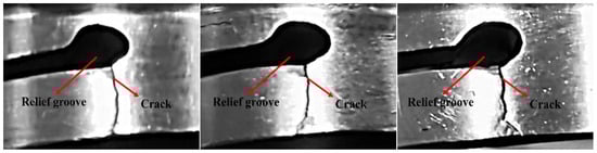 According to the optimized structural parameters of the relief groove, another batch of test samples was remanufactured and the fatigue life test was carried out under the same test conditions as before. The average life of the test samples is 18,000 cycles, which is increased by about 85.6% compared with the fatigue life of the torsion spring specimen with a circular relief groove of 9700 cycles. The cracking locations of the torsion springs are shown in Figure 16. The tests results are shown in Table 9.