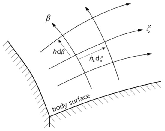 On the surface, the inviscid streamline coordinates and were employed as described in Figure 2. is a coordinate along the streamline, and is a coordinate perpendicular to the streamline [].
