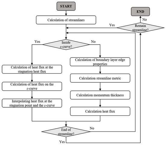 The first step in estimating the heat flux using approximate convective-heating equations is to calculate the streamline. Next, the heat flux can be predicted at each point along the streamline from the stagnation point to the endpoint (seed) of the streamline. If the calculation point is inside the ε-curve, the heat flux is obtained by interpolating the heat flux at the stagnation point using Equations (10) and (11) and on the ε-curve using Equation (12). If the calculation point is outside the ε-curve, the boundary layer edge properties are calculated based on the modified Newtonian theory. Then, the streamline metric and momentum thickness are computed from these properties using Equations (3) and (4) and (6)–(9). Finally, the heat flux at this point is estimated from the computed momentum thickness using Equation (5). This procedure is illustrated in Figure 3.