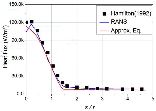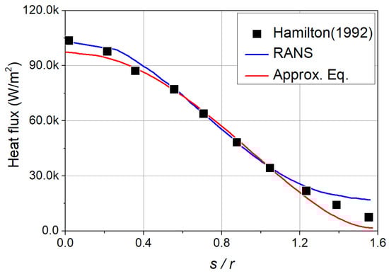The heat flux on the ε-curve was calculated without integration because the momentum thickness on the ε-curve was computed using Equation (12). The heat flux inside the ε-curve was computed by interpolating the heat flux at the stagnation point and the ε-curve.