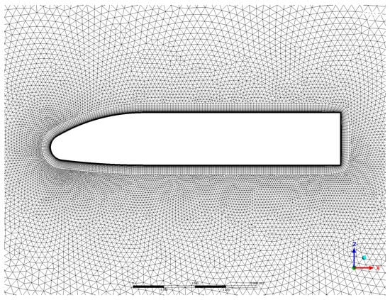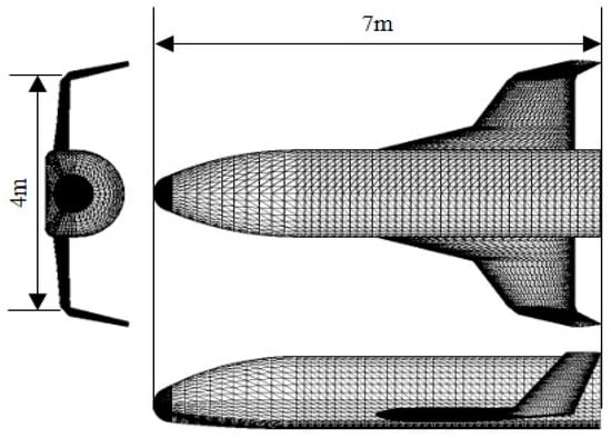 Furthermore, the heat fluxes on the wing–body configuration using the RANS and the approximate convective-heating equations were calculated for comparison with more complex geometry. As shown in Figure 6, Korea Aerospace Research Institute’s KSP-1, which is a three-ton class vehicle with a 7 m fuselage and 4 m span wing, was adopted. The freestream and wall conditions of KSP-1 are described in Table 3. The computational mesh used for the RANS calculation is depicted in Figure 7. An unstructured hybrid mesh with 50 prism layers was utilized, and the number of node points was approximately 10,000,000. To calculate the heat flux using the approximate convective-heating equations, the body surface was discretized into 80 grids in the longitudinal direction and 58 grids to represent a cross-section. The wing surface was discretized into 20 grids in the span and 128 grids to represent the airfoil.