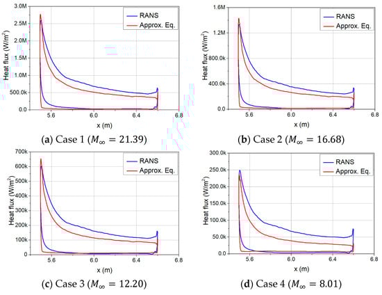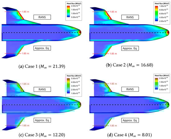 The results of the RANS and approximate convective-heating equation, which are shown in Figure 8, are similar to each other. For a detailed comparison, the heat fluxes along the wing section of 1.85 m are plotted and displayed in Figure 9. The peaks of the heat fluxes are in good agreement, and the trends of the heat fluxes with variations in the x-coordinates are similar. From the sphere and KSP-1 results, the approximate convective-heating equations used in this paper showed sufficient accuracy for calculating the heat flux.