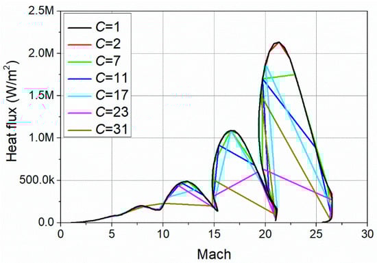 First, the constant was determined numerically. According to Table 4, the total computational cost decreased with an increasing because a large reduced the number of computations. However, when using the constant C, the time at the original maximum stagnation heat flux was skipped due to the increased , resulting in inaccurate maximum stagnation heat fluxes, as observed in Table 4 and Figure 10. The maximum heat flux was particularly important because the spacecraft should withstand the maximum value.