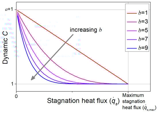 In the previous section, if a constant value of was used, the heat flux calculation could not be performed for the maximum heat flux position in the trajectory. To address this problem, it is necessary to use a small at a high heat flux for accurate calculations, and a large at a low heat flux for efficient calculations. Thus, a dynamic was adopted using the heat flux at the stagnation point of as the control value of because the estimation of the heat flux at this point did not require a time-consuming streamline calculation. Furthermore, a stagnation heat flux could represent the characteristics of heat fluxes in certain conditions because the changes in the heat fluxes at the stagnation point could express the changes in the general heat fluxes. Notably, the stagnation heat flux may not be at its maximum because of the shape of the shock wave and the laminar–turbulent flow transition. Using the heat flux at the stagnation point , the dynamic factor was defined as follows:
