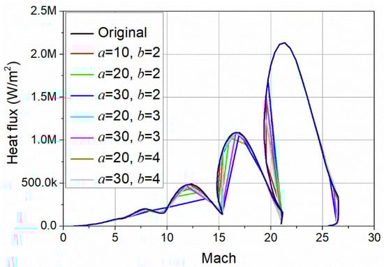 where and are the parameters that control the time step of the heat flux evaluation along the trajectory, and is the maximum heat flux at the stagnation point throughout the trajectory. The dynamic factor in Equation (14) was determined based on the difference between the heat flux at an instant () and the maximum heat flux at the stagnation point throughout the trajectory (). The maximum heat flux is an important property that needs to be analyzed throughout the trajectory of hypersonic vehicles to evaluate the possibility of destruction and damage. According to Equation (14), the time step decreased when the heat flux at the stagnation point was high, and the time step increased when the heat flux was low. This phenomenon indicated that the efficiency of the heat flux calculation within multidisciplinary analysis was improved with an elongated time step under low heat flux conditions. In addition, detailed information on the heat flux was obtained by shortening the time step under high heat flux conditions because periods with high heat flux are important due to the possibility of destruction and damage to the vehicles. The maximum time step increased with a larger value of because the maximum value of increased. If increased, the time step decreased at a low stagnation heat flux because the value of was low, as described in Figure 11.