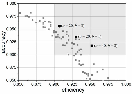 If decreased, the efficiency decreased because was small; if increased, the efficiency increased because was large. If decreased, the accuracy decreased because became constant; if increased, the accuracy increased because trended toward one. Figure 13 shows a plot of the efficiency and accuracy according to and . The shadow region in Figure 13 is the zone with efficiencies and accuracies higher than 0.9. In Table 6, the three samples in the region (indicated by bold squares in Figure 13) are described. When and are 40 and 2, respectively, the efficiency is high, and the accuracy is relatively low. However, the accuracy is high with and despite the relatively low efficiency. The efficiency and accuracy of the other are compromised.