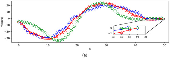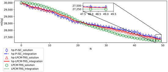 To facilitate a comprehensive comparison of the optimization results’ accuracy, the discrete control and state quantities obtained from the optimization are utilized in the nonlinear dynamic equation. This yields discrete differential values, which are then integrated through time-stepping to produce continuous state quantity curves. To maintain consistency in the subsequent legends, the discrete numerical solutions in the figures are denoted by red triangles and green circles corresponding to hp-LPGM-TR and LPCM, respectively. The integrated continuous solutions are represented by red lines and green lines for hp-LPCM-TRS and LPCM-TRS, respectively. Additionally, the blue diamonds and lines represent the discrete numerical solutions and integrated continuous solutions of the hp-P-iSC method.